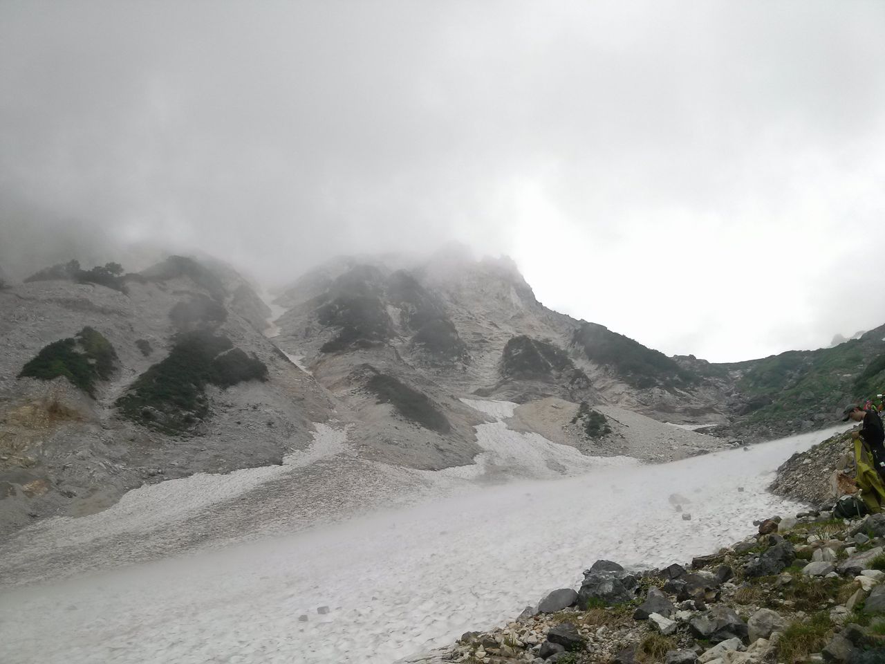雪渓をはさんで向こう側は落石がしょっちゅうありました