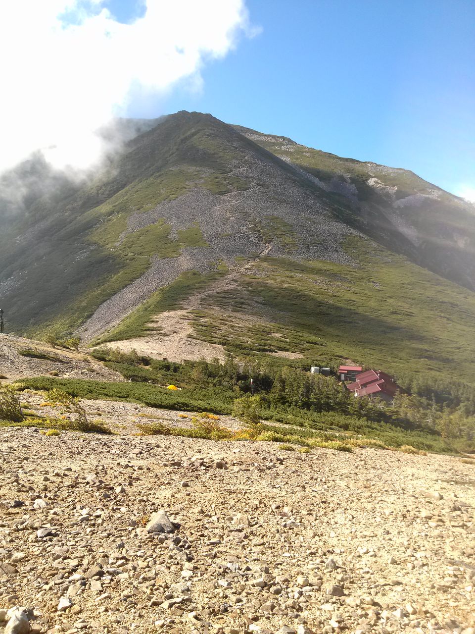 ガスの切れ目より遥か上方に燕山荘が見えました