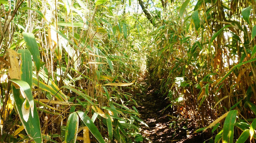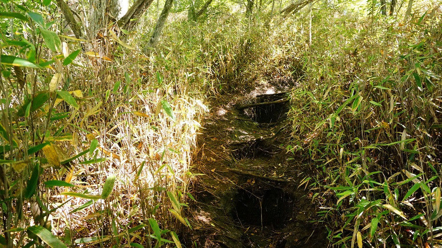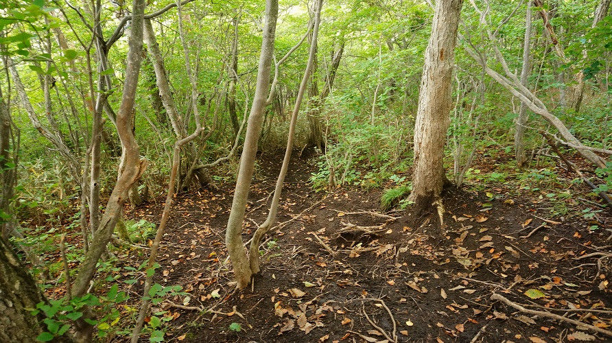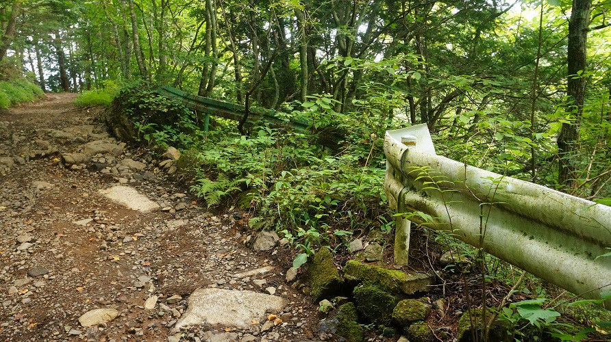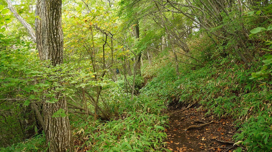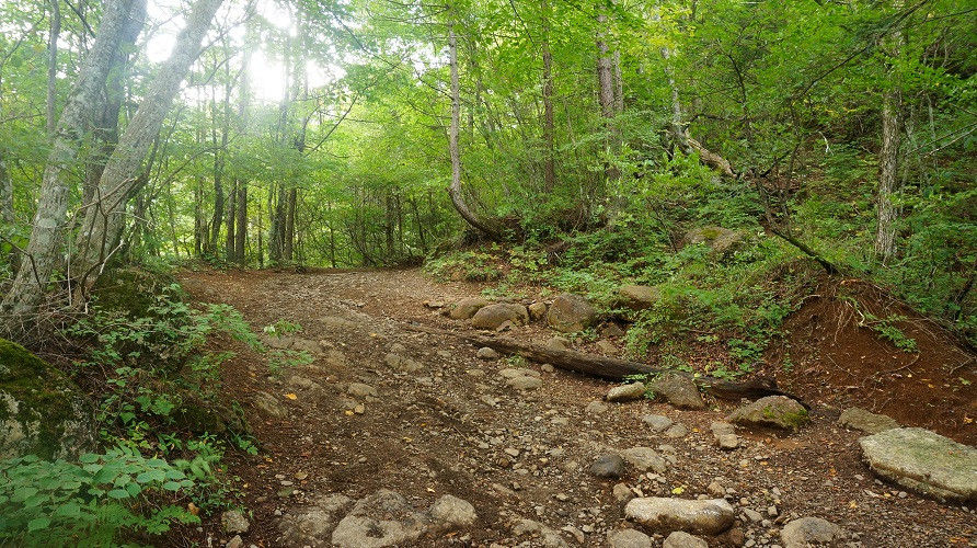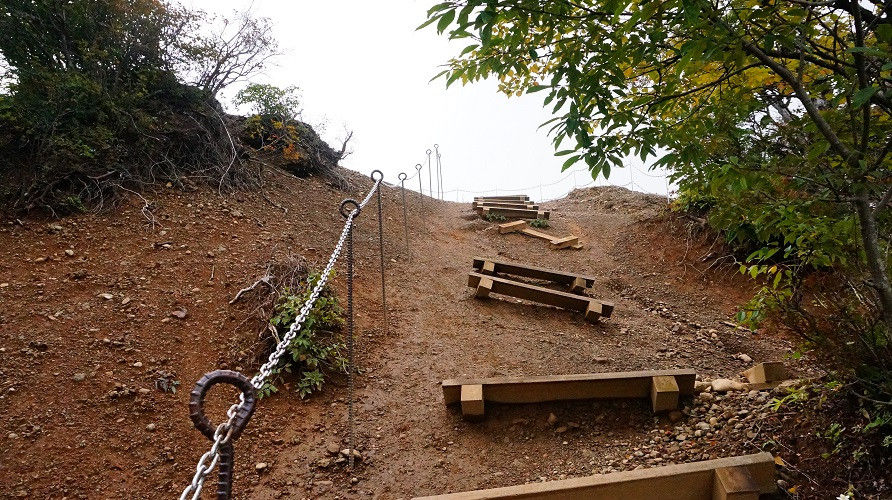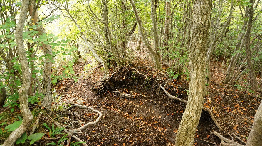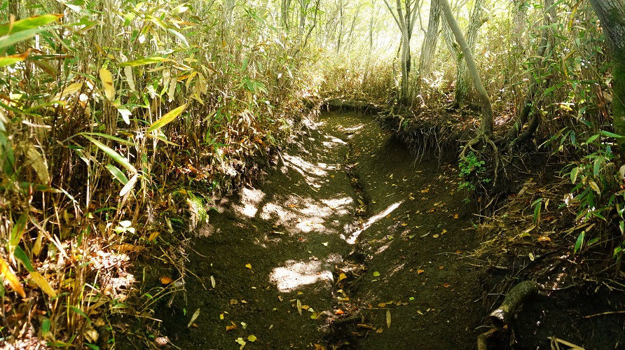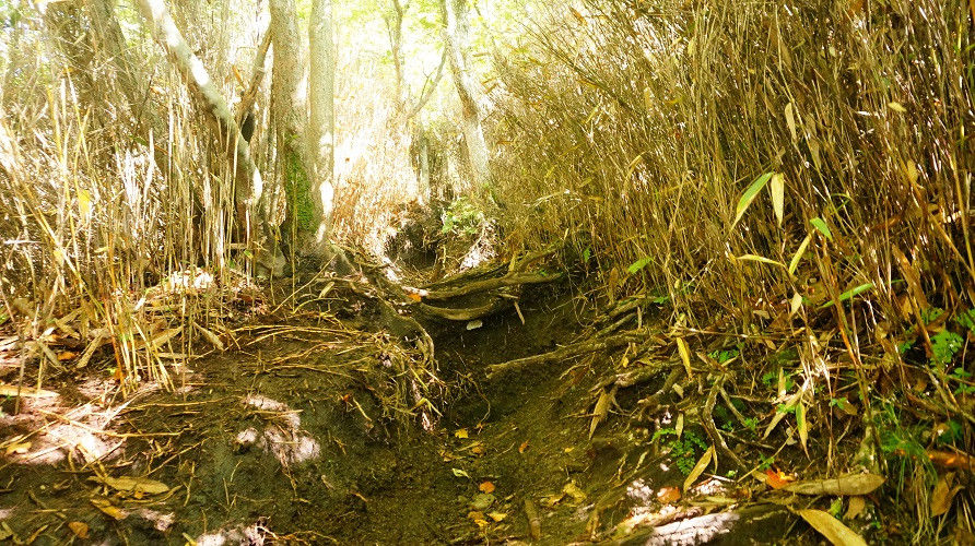 写真のような登山道なのか獣道なのか雨によって落ち葉が流されただけ