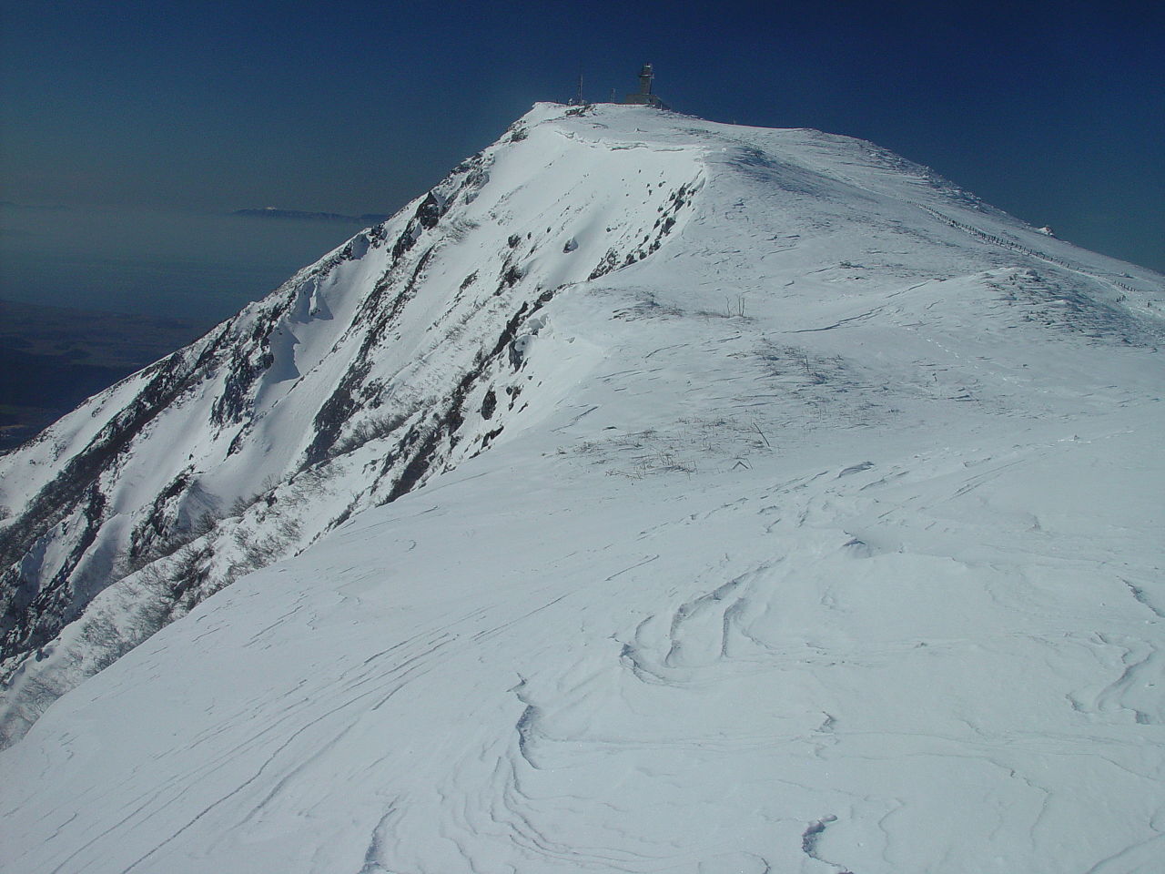 その急斜面上には雪庇が出来やすいんだけど、冬のルート(夏よりも少し西側から稜線に出る)を知らない人が、よく雪庇の端まで来て下をのぞき込んでいて、下を歩くのが怖い時がある。