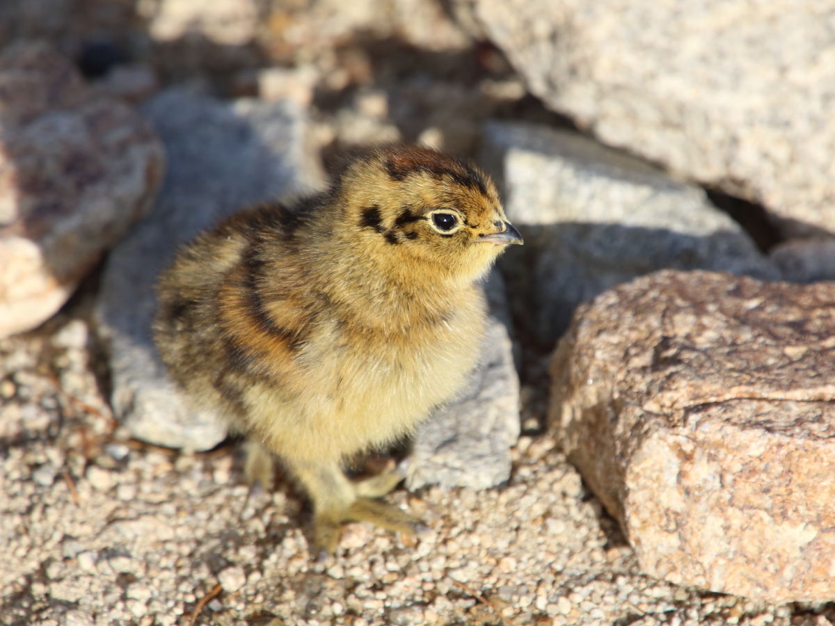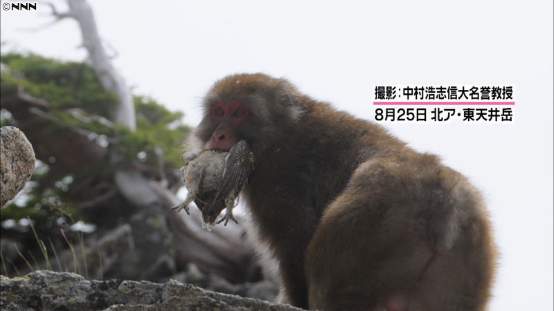 25日、ニホンザルがライチョウのヒナを捕まえて頭から食べている瞬間の写真を、松本市と安曇野市にまたがる北アルプス東天井岳で、信州大学の教授が撮影した。