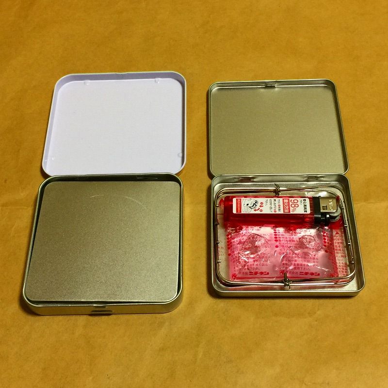 四角いほうは無印良品の灰皿、底にアルミ板を接着して漏れないようにした、容量はどちらも20ccほど