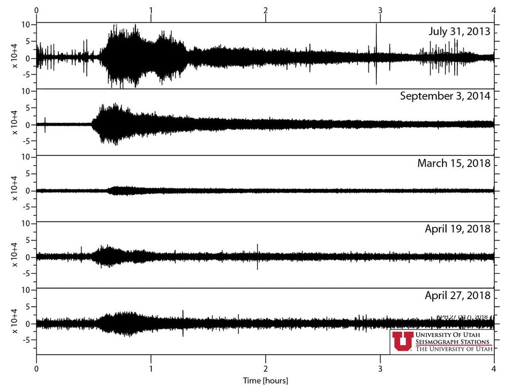2013年と2014年に起こった噴出時の地震波との比較。3月15日は小さかったが、最後に発生した4月27日は今季最大だった