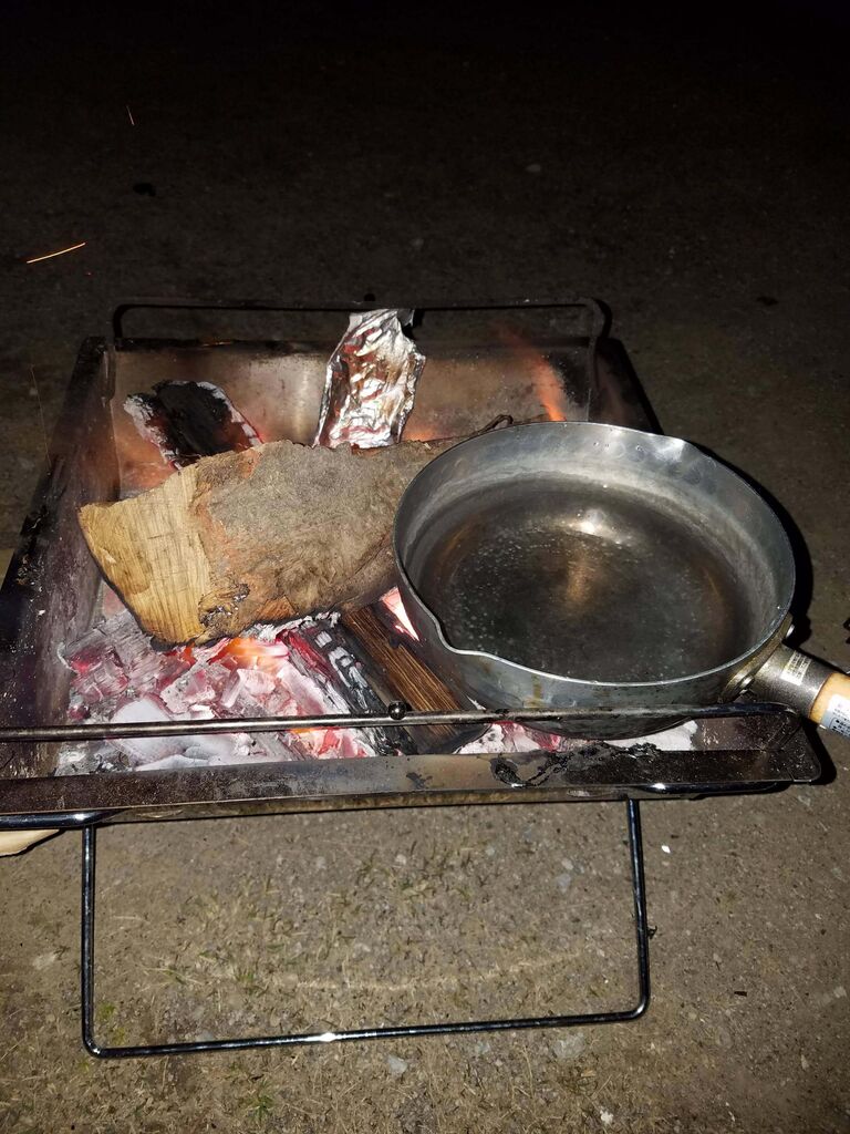 焚き火台、飲み物、食べ物も別で、別々に車で来とるから買い出しも別々やで!