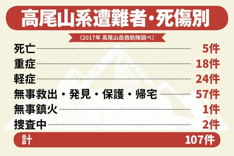 「遭難の原因は、滑落、転倒、道迷い、疲労、病気などさまざまです。多くが無事に救出できましたが、死亡が5件、重傷が18件ありました。死亡事例のうち2件は病死で、56歳の男性が急性心筋梗塞、50歳の男性が急性心機能不全でした。それに自殺(首吊り)が1件。あとの2件は滑落で亡くなっています」(高尾山岳救助隊)