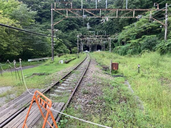 トロッコが廃線を走ってる