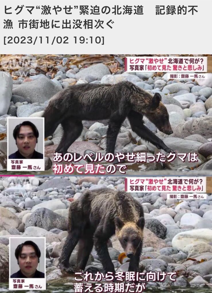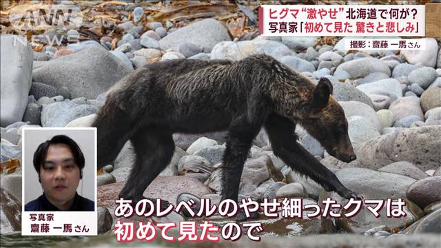 写真家 齋藤一馬さん:「あのレベルの痩せ細ったクマは初めて見たので、本当に餌(えさ)がないんだなと驚いた。これから冬眠に向けて蓄える時期だが、無事に冬を越せるのかなと悲しくなる。あの姿を見ると」