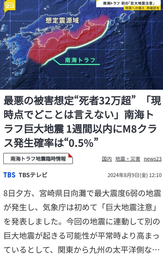 ワイらが我慢できるのが1週間くらいやから1週間気をつけろって言われてるだけで常に地震リスクって付きまとうんやろ