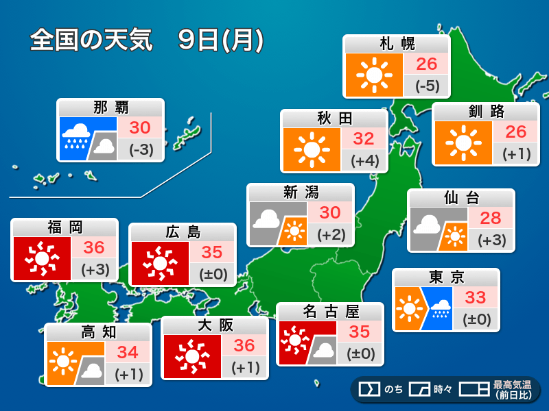 今日9日(月)も西日本から東海は晴れて気温が上がります。35℃以上の猛暑日となるところがあり、厳しい残暑が続く見込みです。