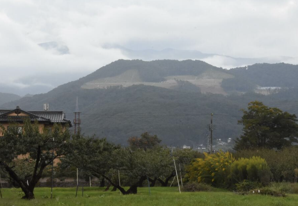 JR福島駅の新幹線ホームから、西にそびえる吾妻連峰の一部の山肌がむき出しになっているのが見えた。連峰の一角、先達山(せんだつやま)の斜面に来春完成予定のメガソーラーの建設地だ。