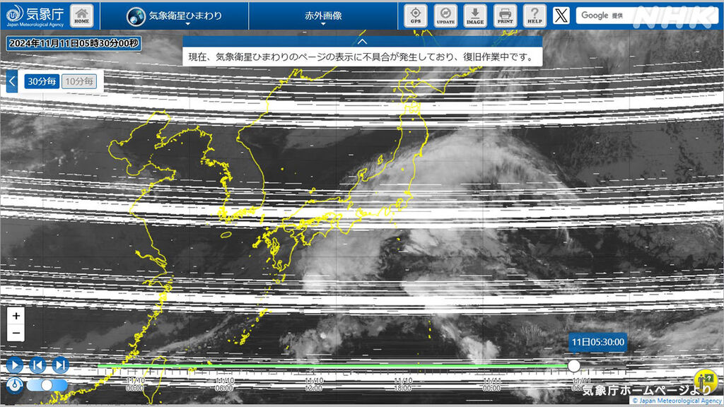 気象庁によりますと、「気象衛星ひまわり」の「赤外画像」が11日5時半の画像から気象庁のホームページ上で正常に表示できなくなっているということです。