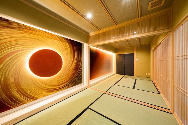 金箔(きんぱく)が渦を巻くデザインで、真言密教の瞑想(めいそう)法「月輪観」に由来する。