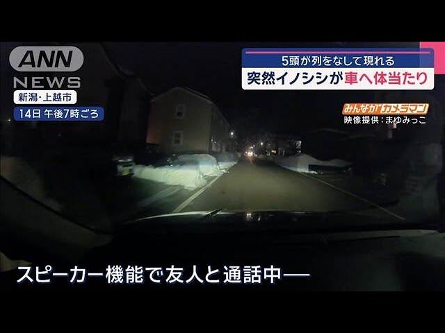 女性にけがはありませんでしたが、体当たりされた車はイノシシの毛と泥で汚れ、右側のバンパーが外れてしまったといいます。