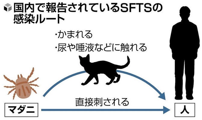 SFTSは、主にウイルスを持ったマダニに刺されることにより感染する。6~14日の潜伏期間の後、発熱や頭痛、下痢などの症状が出る。国内での致死率は27%とされる。治療には新型インフルエンザの治療用に開発された抗ウイルス薬「アビガン」が使える。